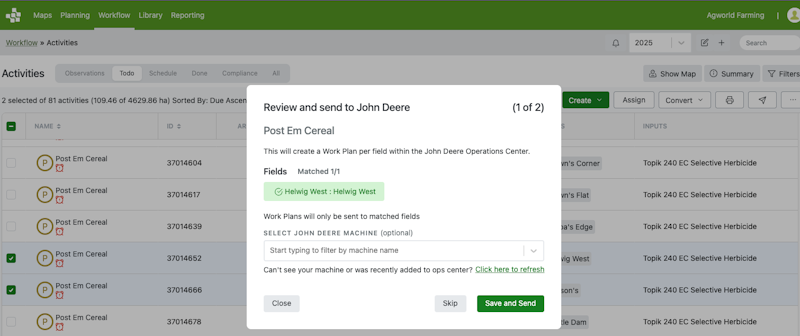 How the integration works: sending activities from Agworld to John Deere When you receive or create a plan, recommendation or work order in Agworld, this activity can be sent to Work Planner in the John Deere Operations Centre with the associated field, boundary and other tank mix information. Once the activity is sent from the Work Planner to the machine, it will be available on the in-cab screen in your machine for spraying.