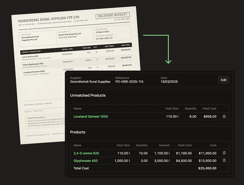 When crop inputs such as chemicals or fertilizers are delivered to your farm, you'll usually receive documentation like an invoice or delivery note with the shipment. Until now, most growers store these documents in a filing cabinet, digital folder or the footwell of their ute. With this latest update to Shed, you can simply take a photo of this document and Shed will automatically fill in the details for you. Shed will also attach all relevant documents directly to the receipt record, creating a single, centralized source of truth for inventory deliveries.